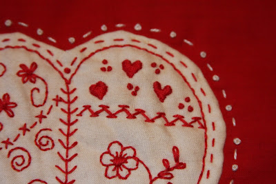 Here is a quick, little project that I started Monday night. First off... I got a job. Well, a part time job... well, ok I work 1 day a week, but it's at the local quilt store! :) So last year at the local quilt store I picked up this little pattern by Birdbrain Designs and it sat in a drawer waiting. Well, now I work there, so I thought I should stitch this up for the shop. Monday was my first day. I came home and while Corey and I watched a movie I stitched it... it's really an easy little stitch. Now, I've cut it out and appliquéd it to a lovely piece of red cotton fabric by Kaffe. Then added the straight stitch and french knots. I'm going to make it into a little heart shaped pillow with cream ric-rac along the seam to make a scallop... I think it will be cute! http://www.deercountryquilts.com/